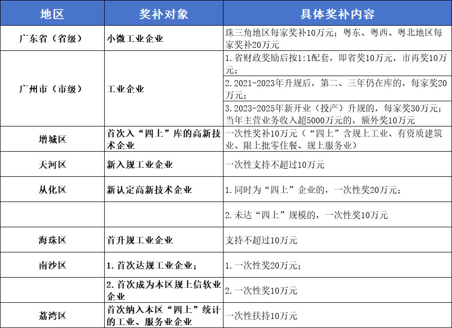 目前广东省及下辖各市、区针对小升规企业推出多重奖补,企业可根据注册地申请对应扶持,部分核心政策如下: