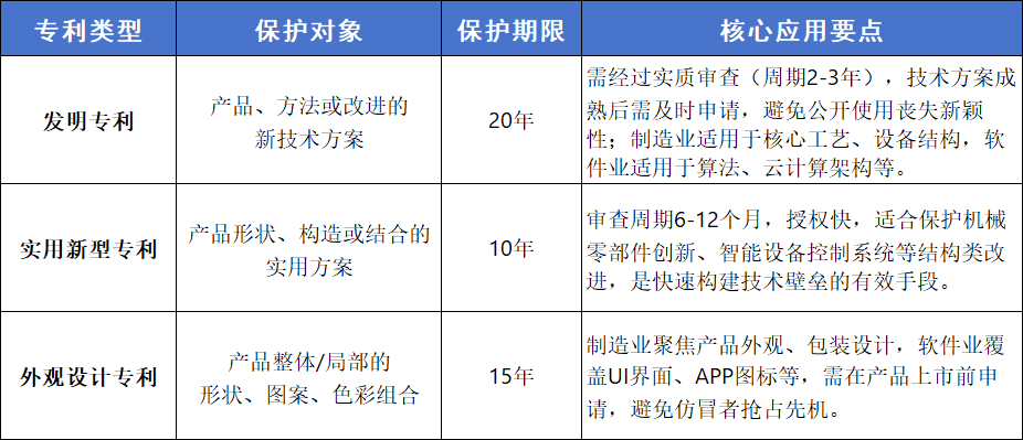 无论是制造业还是软件业,专利权、商标权、著作权都是基础且核心的知识产权类型,其保护规则与应用场景需精准把握。