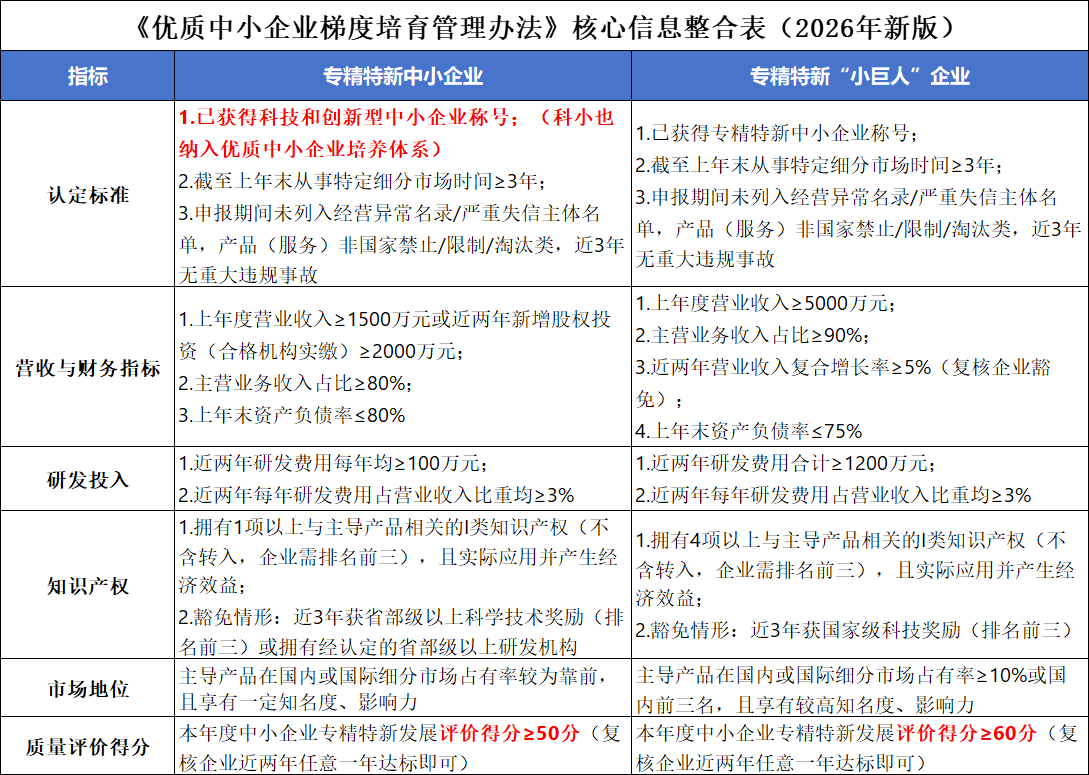 2026年1月16日,工业和信息化部印发《优质中小企业梯度培育管理办法》,2026年4月1日正式实施,旧版专精特新相关认定标准同步废止!这场力度空前的政策调整,不仅重构了优质中小企业的梯度培育体系,更对企业的专业化发展、创新能力建设和合规经营提出了全新要求。对于有计划跻身专精特新行列、享受政策红利的中小企业而言,读懂新规、精准备战已成为当前的核心任务。