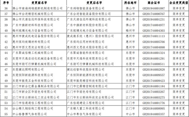 根据《科技部财政部国家税务总局关于修订印发〈高新技术企业认定管理办法〉的通知》(国科发火〔2016〕32号)和《科技部财政部国家税务总局关于修订印发〈高新技术企业认定管理工作指引〉的通知》(国科发火〔2016〕195号)的有关要求,经企业申请、专家评审和公示,广东省造纸研究所有限公司等71家企业发生变更后仍符合高新技术企业认定条件,现予以公告。